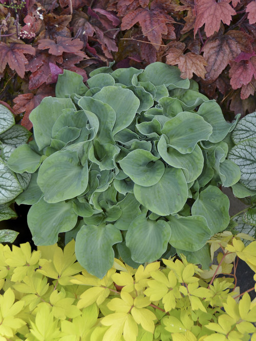 Ruffled blue foliage will hold its deep hue all summer long. Lavender flowers contrast gracefully in midsummer.