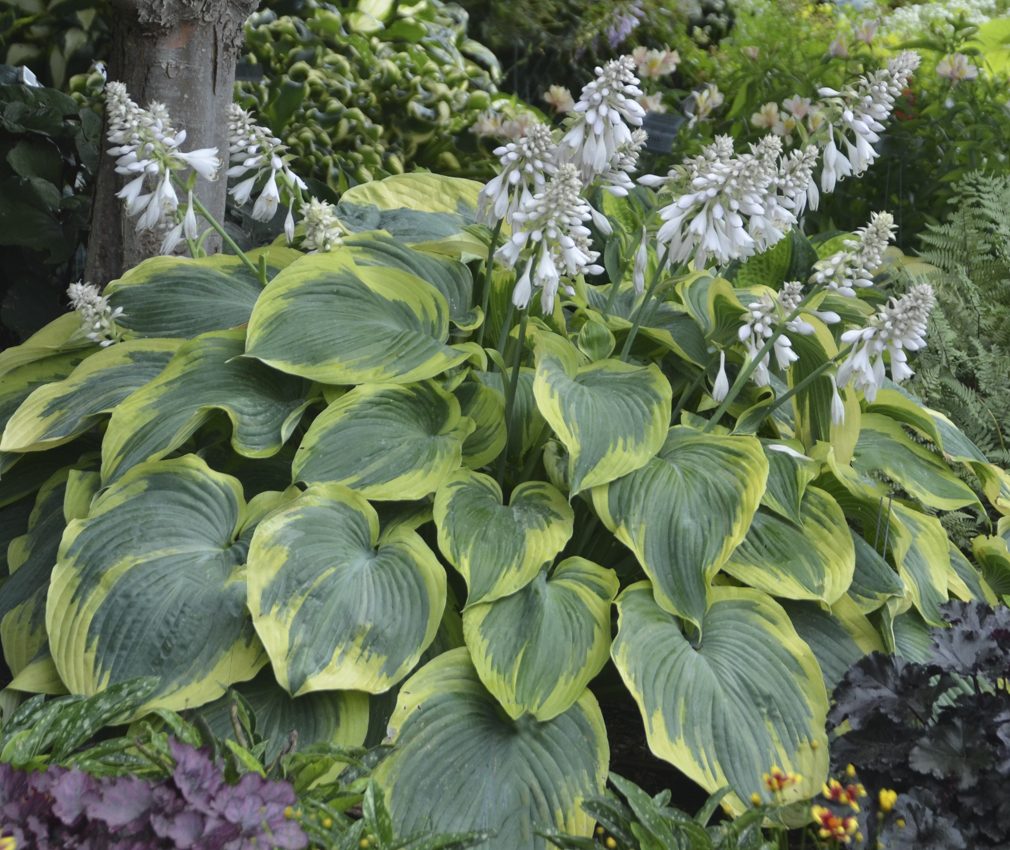 This stylish hosta has broad, dark green foliage with a bright yellow centre—creamy white flowers in early to midsummer.