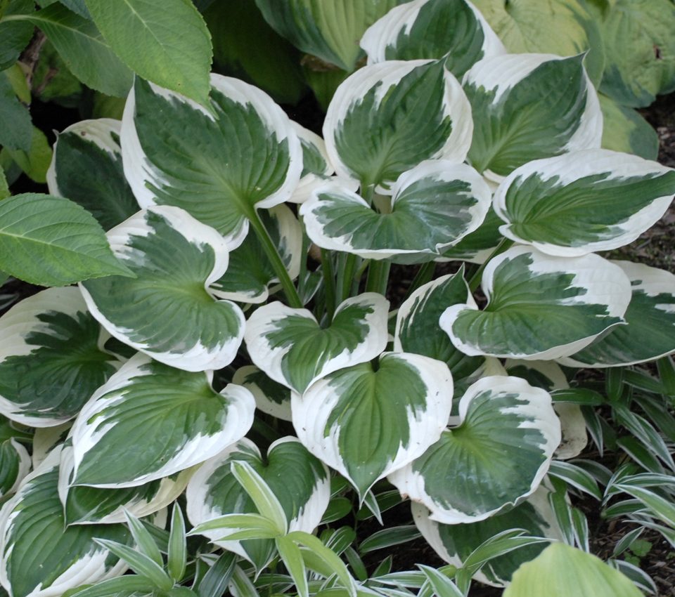 Very dark green leaves edged with a pure white margin make this hosta a stunner. Pale lavender striped flowers appear early to midsummer.