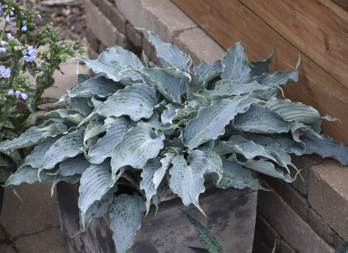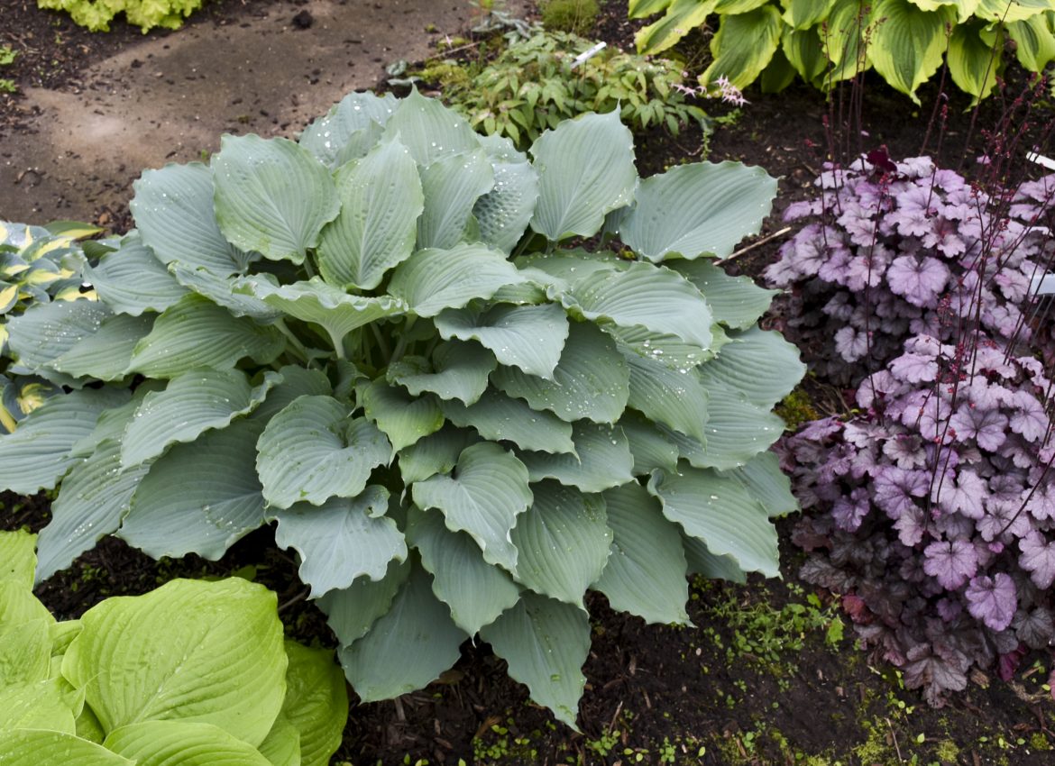 This large blue-hued hosta has attractive heart-shaped corrugated leaves with wavy margins—pale lavender flowers in midsummer.